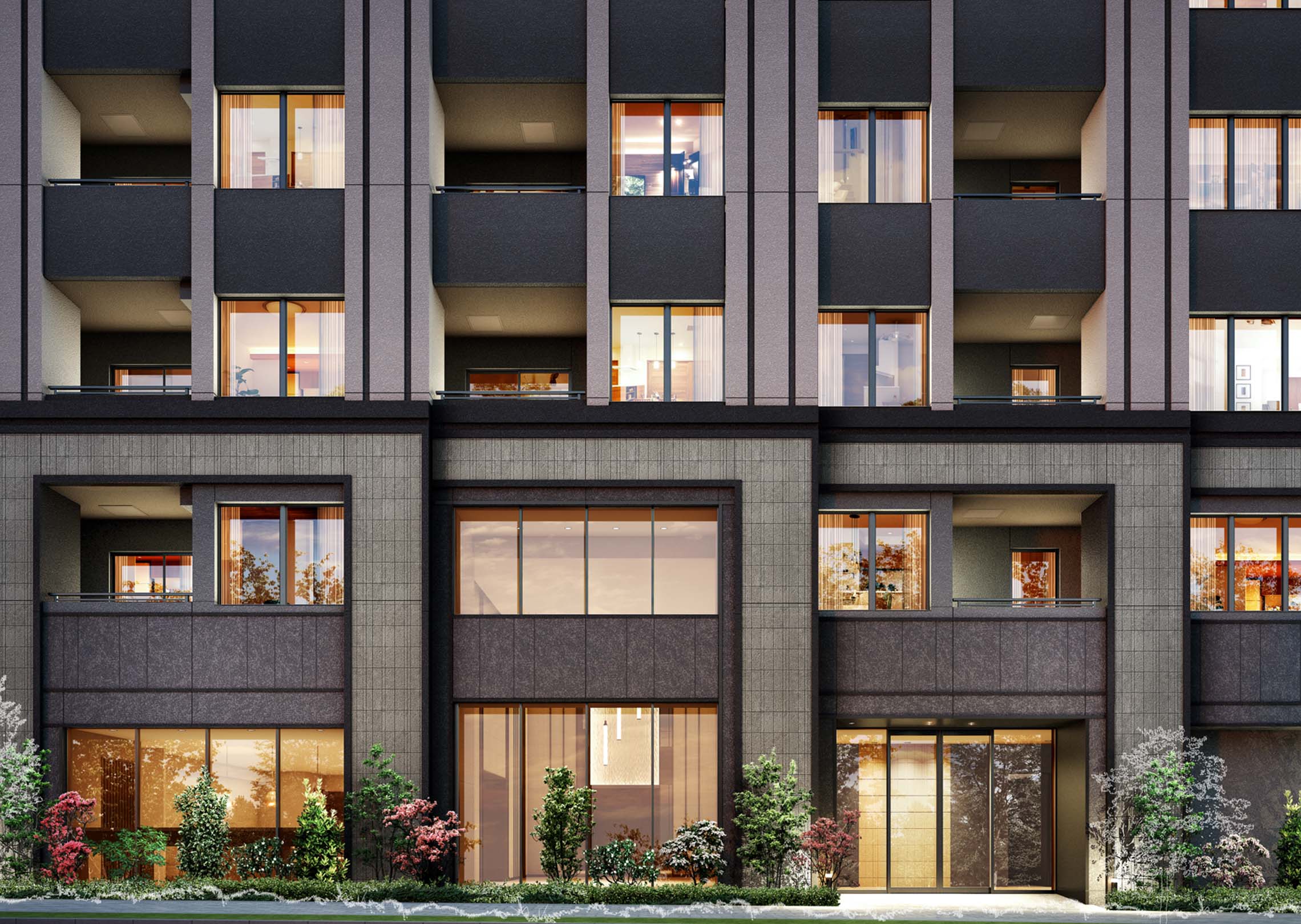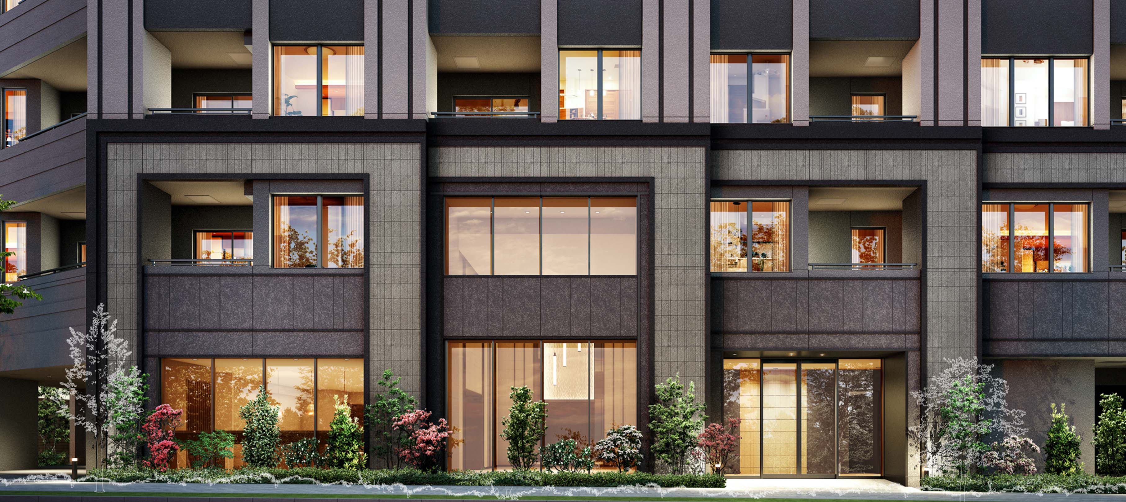 ※掲載の外観・エントランスホール・エントランスアプローチ等の完成予想CGは計画段階の図面を基に描き起こしたもので、実際とは異なります。また、各種機器・配管・設備等は一部省略しております。 尚、植栽は特定の季節・ご入居時の状態を想定して描かれたものでは無く、竣工時には外観等の完成予想CG程度には成長しておりません。樹種等は変更になる場合がございます。周辺の建物・電柱・架線等は 一部簡略化、及び、省略して表現しております。