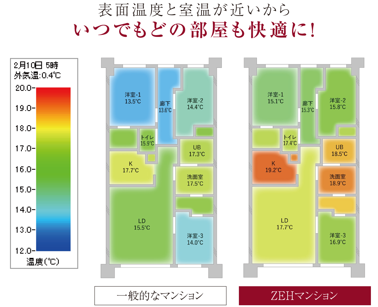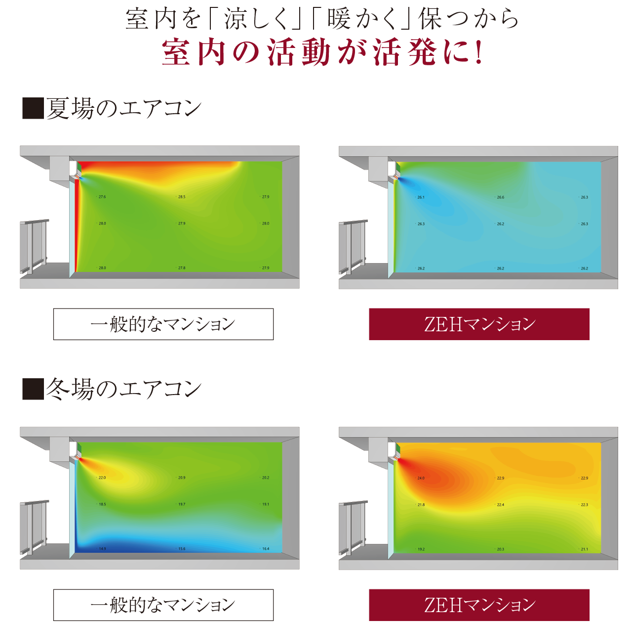 解析条件:温熱環境シミュレーションプログラム[AE-Sim/Heat]にて室内温度分布シミュレーションを実施。冬期最低気温となる日について、前日の就寝前に暖房を停止し、午前5時時点の室内温度(温度降下状況)を表示。外気温度は建設地近傍の標準年拡張アメダス気象データ2020年版を参照、平面プランは当社分譲済物件を想定、エアコンは各居室に1台ずつ設置されているものとし、各居室の空調スケジュールは「HEAT20設計ガイドブック2021(一般社団法人20年先を見据えた日本の高断熱住宅研究会)」に記載の条件を参考、前夜空調停止時刻24時、空調停止時の室温22℃(居室のみ)、『一般的なマンション』品確法断熱等性能等級3程度(平成4年度基準)の外皮性能を想定、『ZEHマンション(本物件)』外壁が0.55[W/(㎡K)]、窓が1.83、2.97[W/(㎡K)]を想定