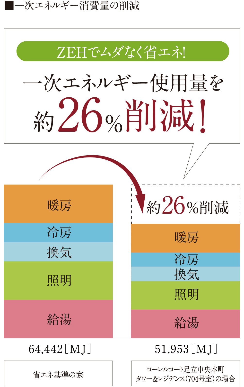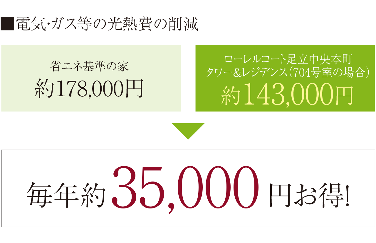 計算条件:『省エネ基準の家』国が定める基準により算出した設計二次エネルギー消費量に設計一次エネルギー消費量に対する基準一次エネルギー消費量の割合を乗じて基準二次エネルギー消費量を算出し、燃料単価、換算係数を乗じて算定。『あなたの家』国が定める基準により算出した設計二次エネルギー消費量に燃料単価、換算係数を乗じて算定。実際の年間光熱費を保証するものではありません。設備の新設維持更新に要する費用は考慮しておりません。燃料単価、換算係数は「総合資源エネルギー調査会省エネルギー・新エネルギー分科会 省エネルギー小委員会小売事業者判断基準ワーキンググループ取りまとめ」を参照。燃料単価のガス(設計)がガス(基準)と異なる場合は、ガス会社の設定単価を反映。※住戸により異なります。詳しくは係員までお問合せください。