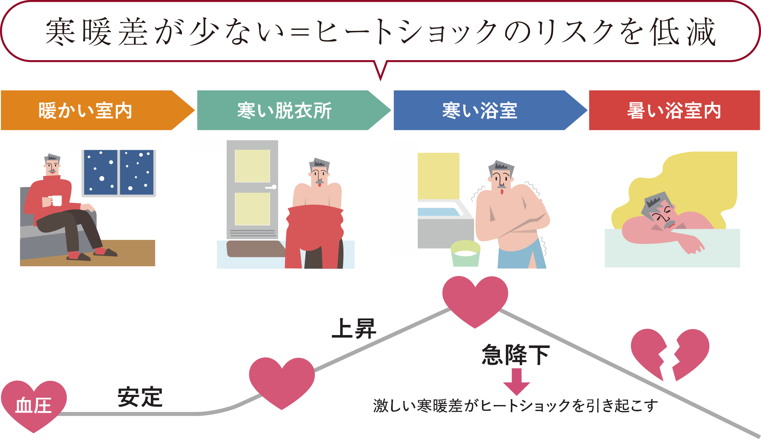 また、住まいの中の寒暖差が少ないことで、ヒートショックのリスクを低減することもできます。